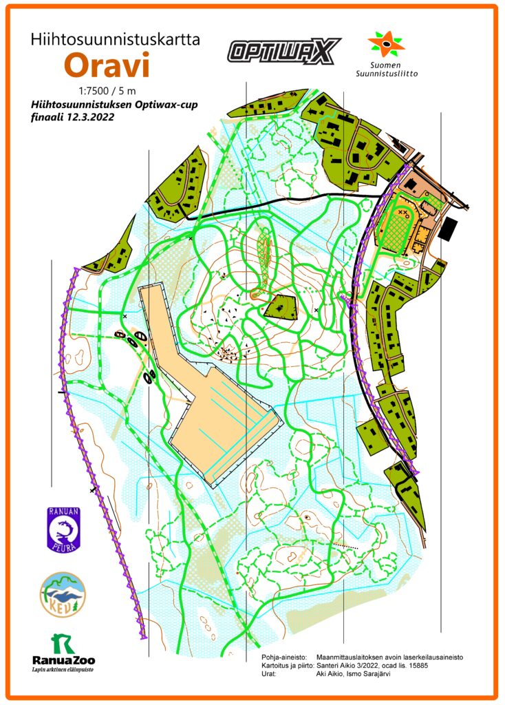 Hiihtosuunnistuskartta, tuloste 3/2026. Mittakaava on sprintissä 1: 5 000, pidennetyllä keskimatkalla ja keskimatkalla 1: 7 500 tai 1: 10 000. Kartan koko A4.